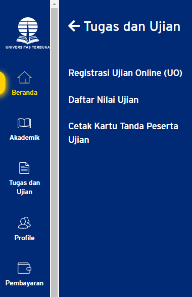 Kedua, menu sia.ut.ac.id tampilan baru memuat menu akademik (Registrasi Mata Kuliah dan Pengiriman Bahan Ajar), Tugas dan Ujian (Registrasi ujian online, daftar nilai ujian, dan cetak kartu tanda ujian), Profile (profile mahasiswa), dan menu pembayaran yang memuat histori pembayaran mahasiswa dari semester pertama hingga terkini.